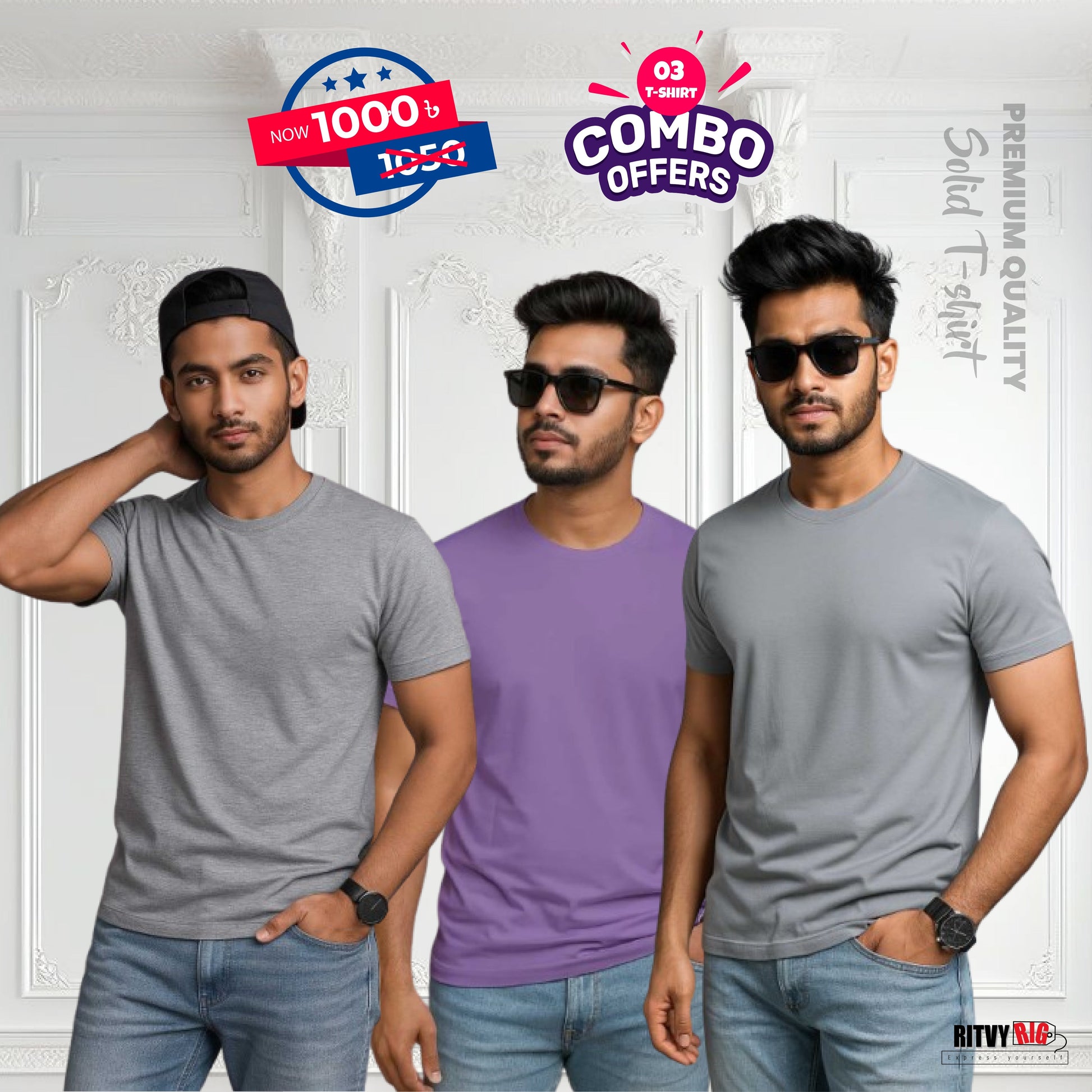 Premium Quality Solid T-shirt Combo (3pcs)- Ash, Purple, Silver